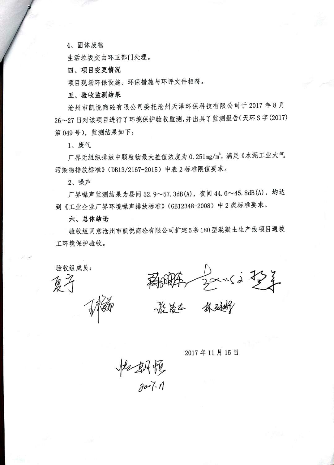 當(dāng)前位置:網(wǎng)站首頁 〉新聞中心 〉詳細(xì)信息根據(jù)2017年10月1日開始實(shí)施的《建設(shè)項(xiàng)目環(huán)境保護(hù)管理?xiàng)l例》的相關(guān)規(guī)定,2017年11月15日滄州市凱悅商砼有限公司組織召開了《擴(kuò)建5條180型混凝土生產(chǎn)線項(xiàng)目竣工環(huán)境保護(hù)驗(yàn)收》技術(shù)評估會(huì),滄州市運(yùn)河區(qū)環(huán)境保護(hù)局、環(huán)評編制單位、環(huán)境監(jiān)測單位、施工單位及特邀專家組成。驗(yàn)收組對項(xiàng)目進(jìn)行了實(shí)地查看,檢查了項(xiàng)目環(huán)境建設(shè)和運(yùn)行情況,聽取了各單位對該項(xiàng)目的竣工驗(yàn)收報(bào)告,在充分討論后認(rèn)為本項(xiàng)目在建設(shè)過程中基本執(zhí)行了國家建設(shè)項(xiàng)目環(huán)境管理制度以及“環(huán)保設(shè)施與主題工程同時(shí)設(shè)計(jì)、同時(shí)施工、同時(shí)投產(chǎn)使用”的規(guī);建設(shè)單位落實(shí)了環(huán)評報(bào)告及其批復(fù)要求的環(huán)境影響治理措施,減緩了項(xiàng)目建設(shè)運(yùn)營中的主要負(fù)面環(huán)境影響,同意通過竣工環(huán)境保護(hù)驗(yàn)收。